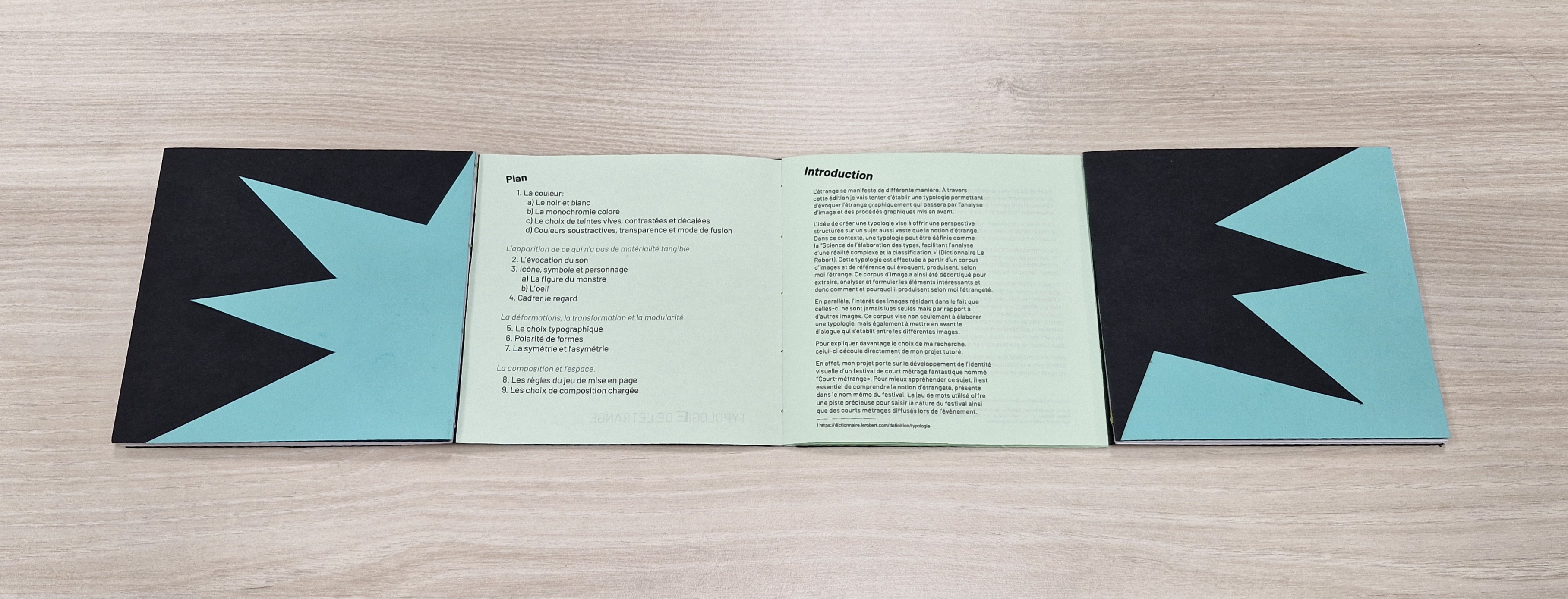 Édition associée à une recherche documentaire traitant d’une problématique : l’étrange graphiquement et d’un choix de réponse : une typologie. De cela découlent des choix graphiques de mise en page, de rapports aux images, de façonnage, etc.