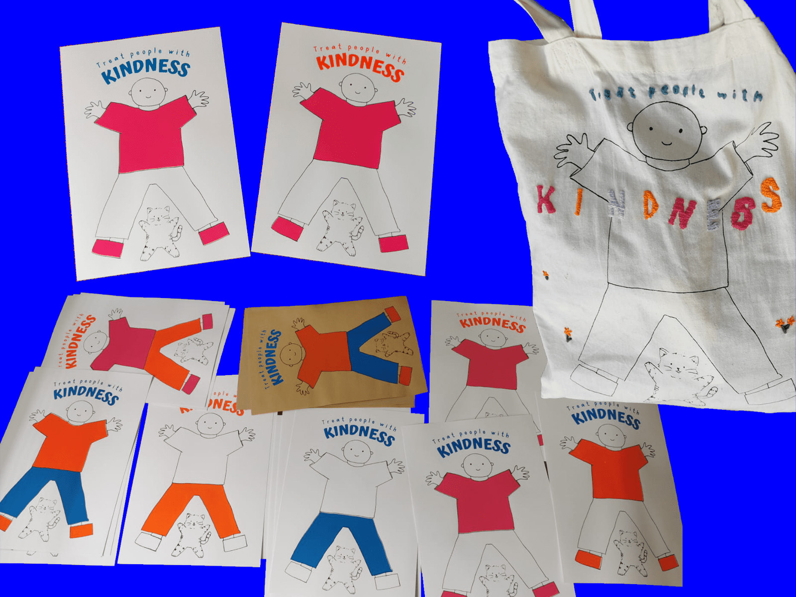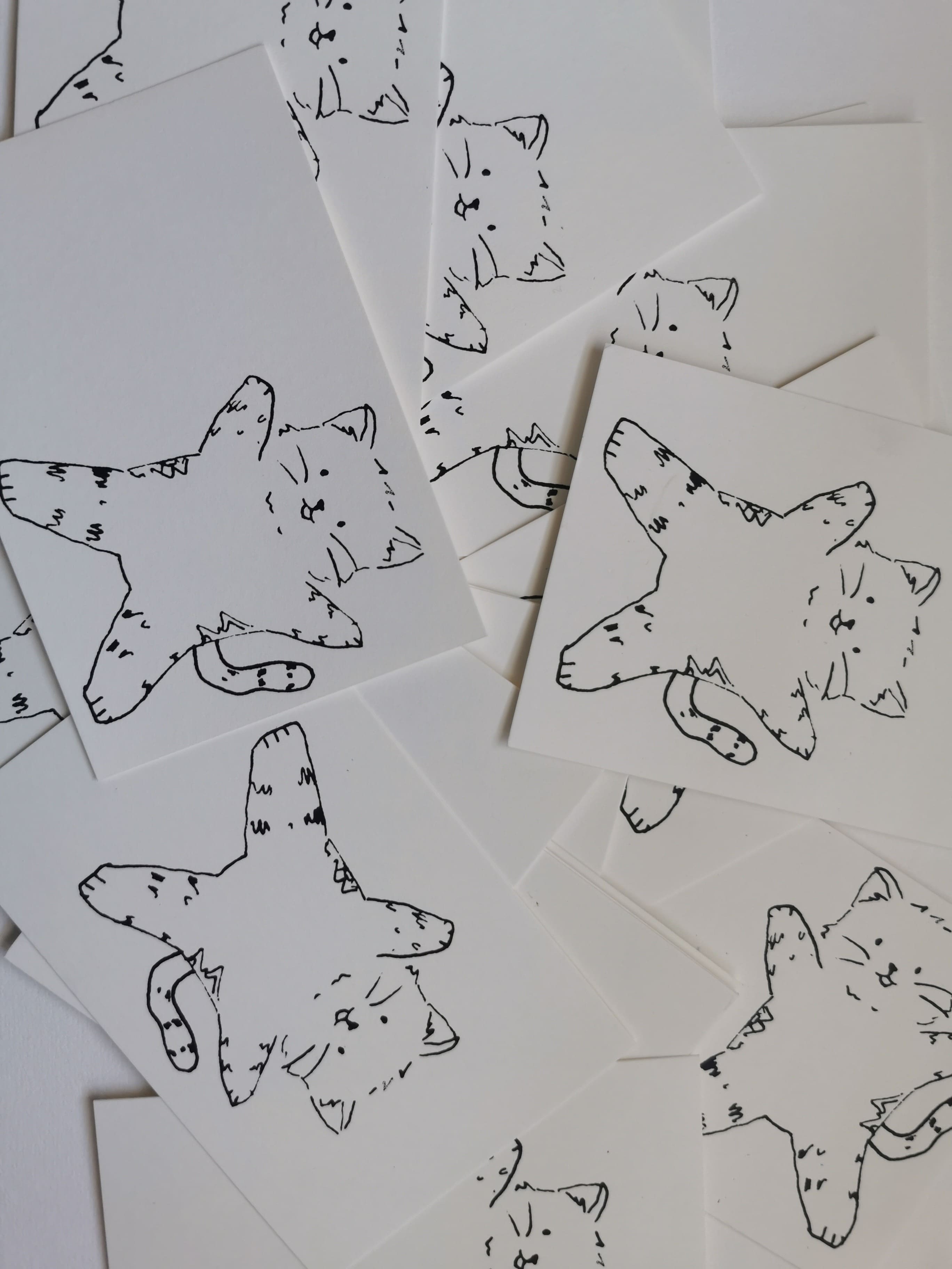 Illustration sérigraphiée au format A3 sur papier, sur un tote Bag, accompagnée de la création d'une petite carte au format A5 reprenant uniquement l'élément du chat.